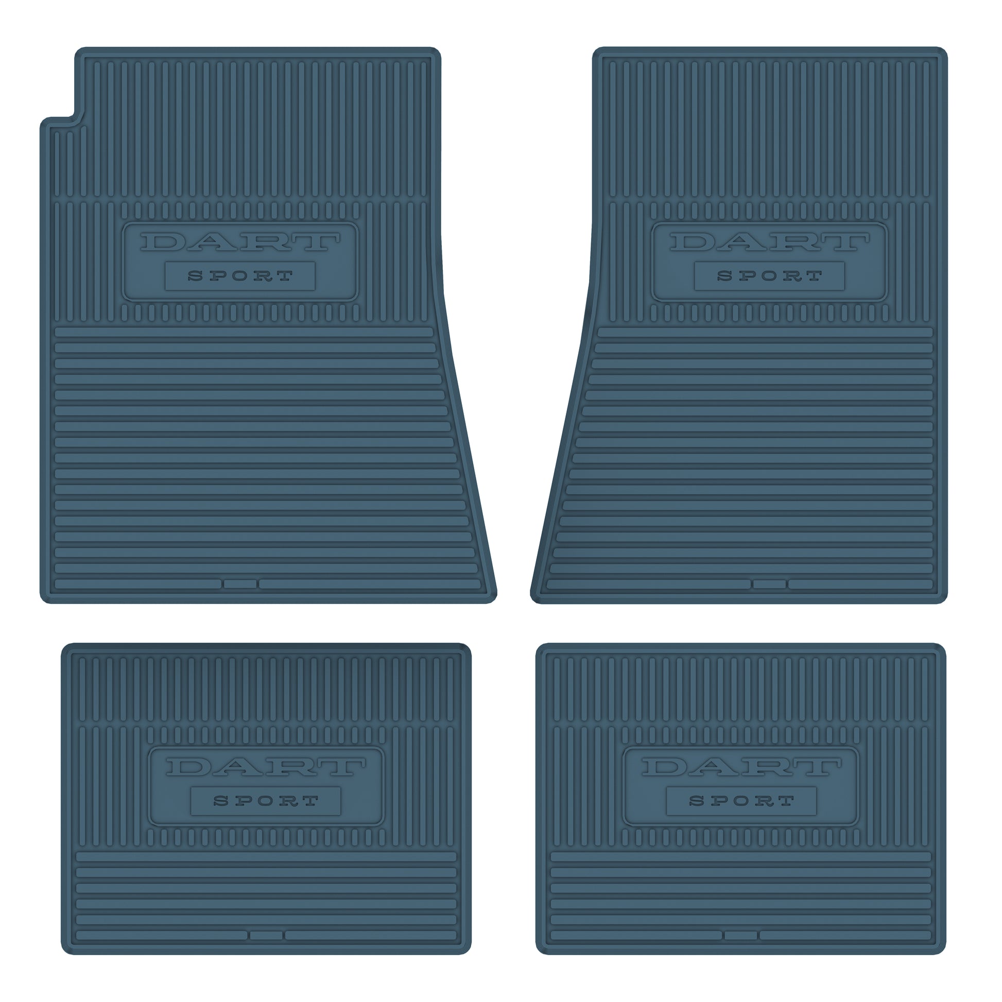• 1973-76 DART SPORT CUSTOM VINTAGE RUBBER STYLE FLOOR MATS DESIGNED TO FIT THE ENTIRE FLOORPAN OF YOUR CAR.CHRYSLER/DODGE/PLYMOUTH LICENSED LOGOS ARE FEATURED ON BOTH FRONT AND REAR MATS.
